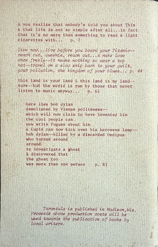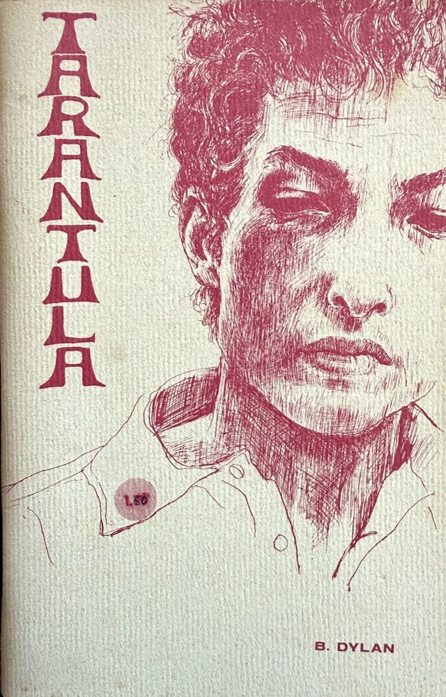 Below: TARANTULA BY ROBERT ZIMMERMAN, stamped "by Robert Zimmerman", bootleg edition, 1969, UK, Compendium Books, London. The first edition was sold at The Isle of Wight festival, among other places. White stapled wraps and mimeographed sheets in black ink, repeatedly stamped “TARANTULA by ROBERT ZIMMERMAN” on the front and the back in red, black and blue inks, 56 pages.