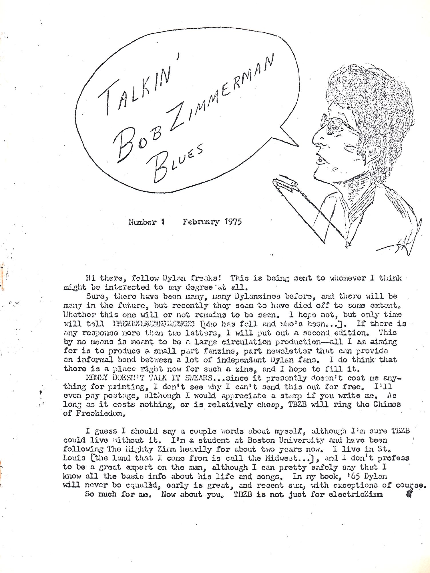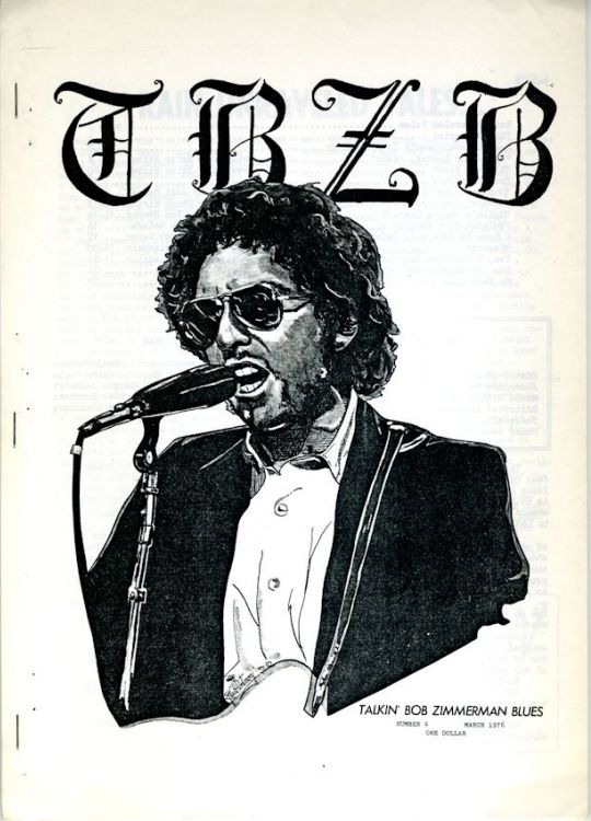There were not less than four names through the years for this historic fanzine: it started with TALKIN' BOB ZIMMERMAN BLUES (issues 1 to 3 1/2 in 1975) and TBZB (issues 4 and 5, 1976), then became ZIMMERMAN