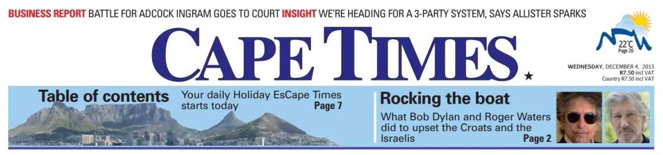 CAPE TIMES is an English-language morning newspaper owned by Independent News & Media SA and published in Cape Town, South Africa. Thank you to Eric Galzi for this item. [1025]