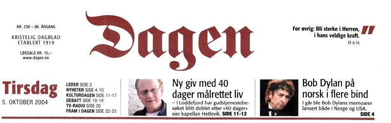 DAGEN is a Norwegian Christian newspaper established in 1919, and published in Bergen. The average circulation in 2004 was 5,307 copies. The ideological goal of the newspaper was "to influence society from a revival Christian point of view". On 1 January 2008 the newspaper merged with another Christian newspaper, MAGAZINET, and was renamed to DAGENMAGAZINET. On 1 April 2011 DAGENMAGAZINET was renamed to DAGEN.