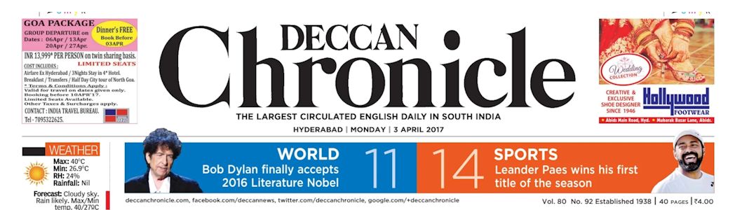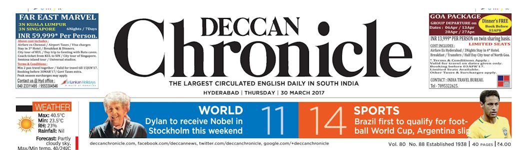 DECCAN CHRONICLEis an English-language daily newspaper based in Hyderabad, India. Founded in 1938, it was initially launched as a weekly and later converted into a daily. The newspaper's name reflects its origins in the Deccan region of India.