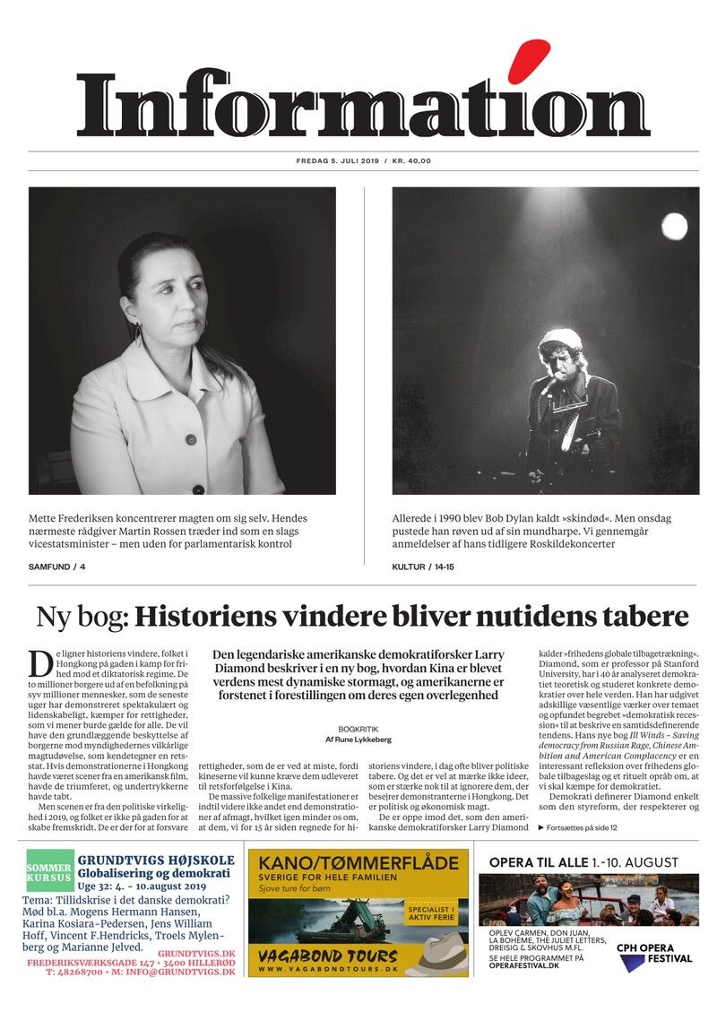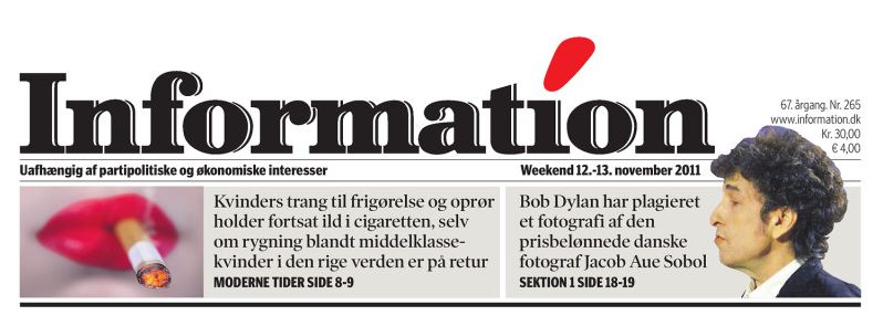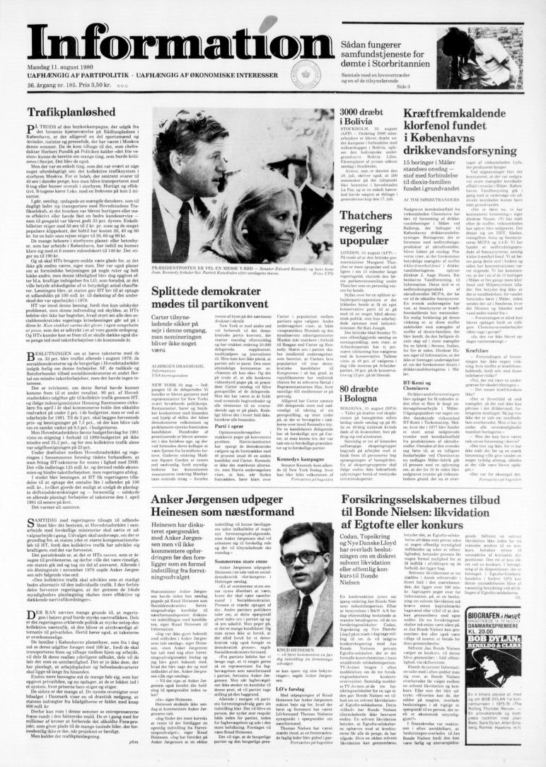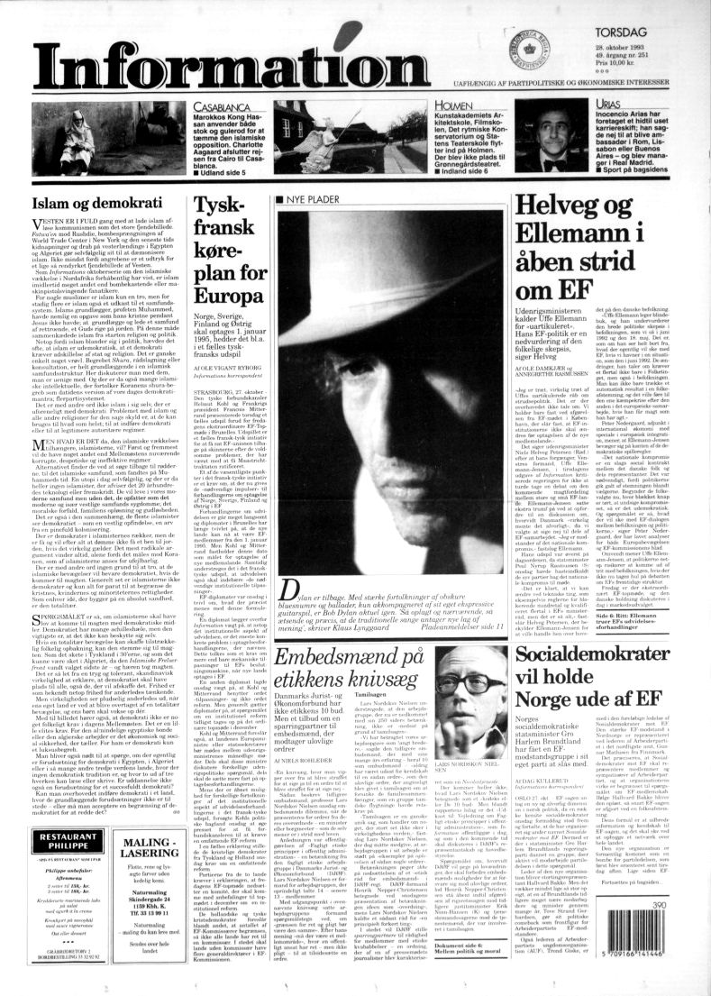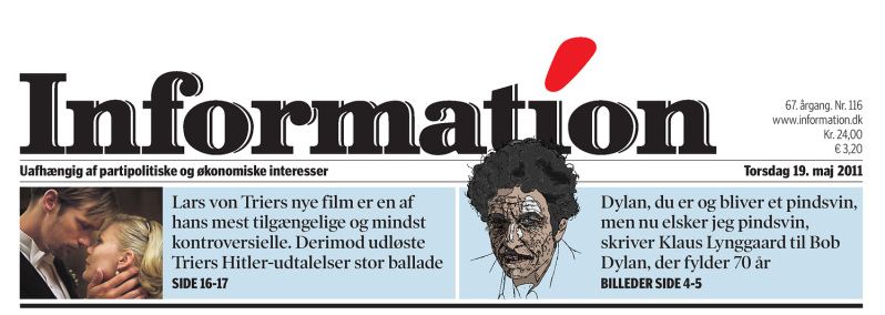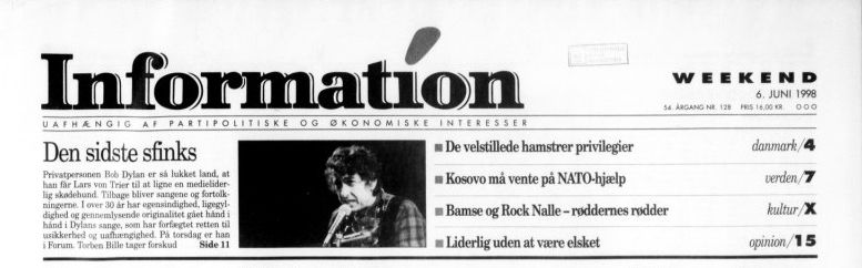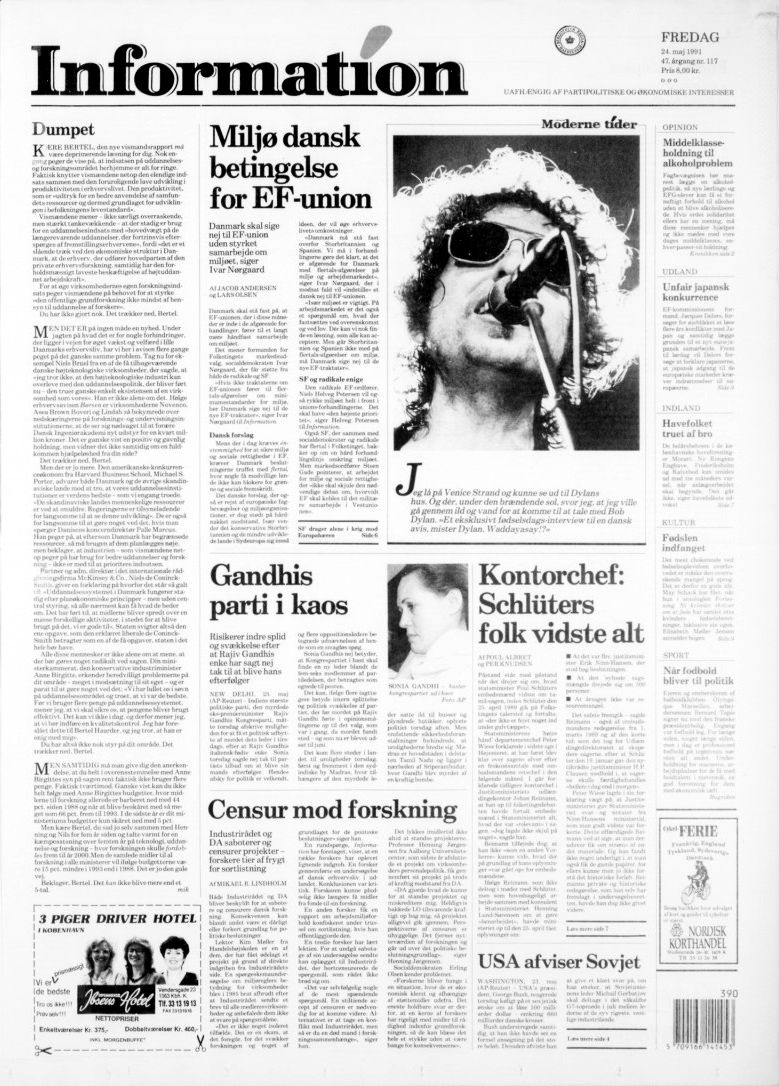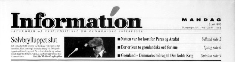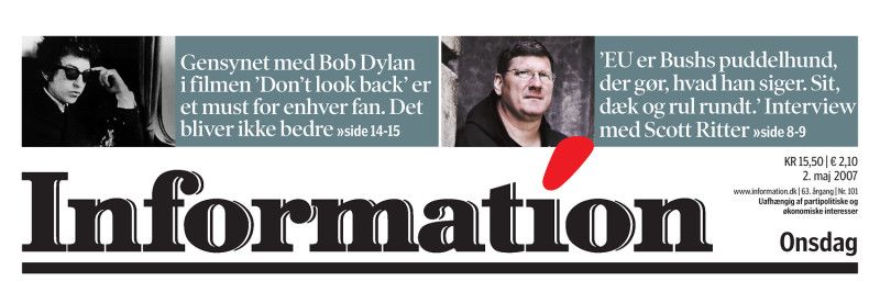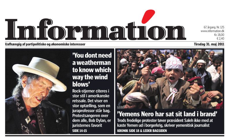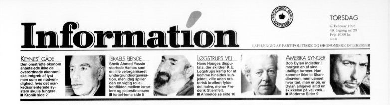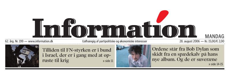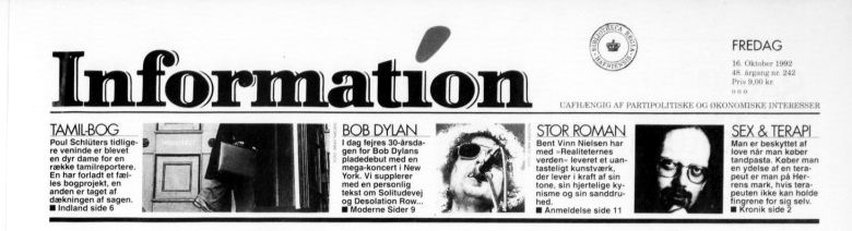 INFORMATION, full name: DAGBLADET INFORMATION, is a Danish newspaper published Monday through Saturday. It was established and published by the Danish resistance movement in 1943 during World War II. The newspaper, despite being politically independent, is regarded as left liberal, or left-wing, and is known for being equally critical in its point of view of all political organizations.