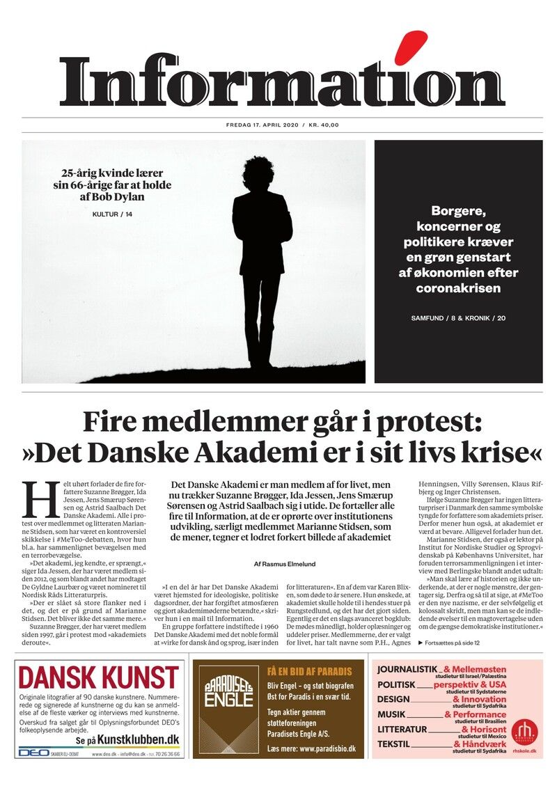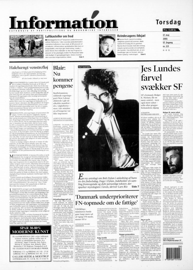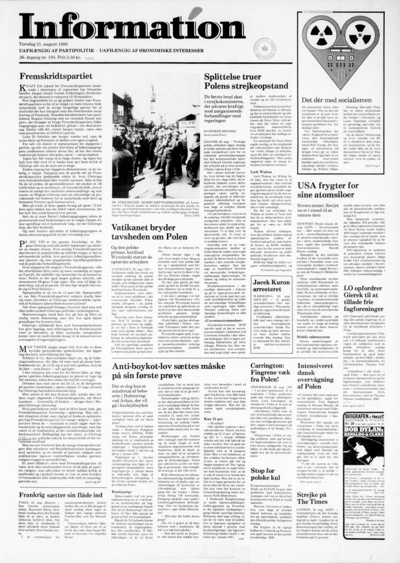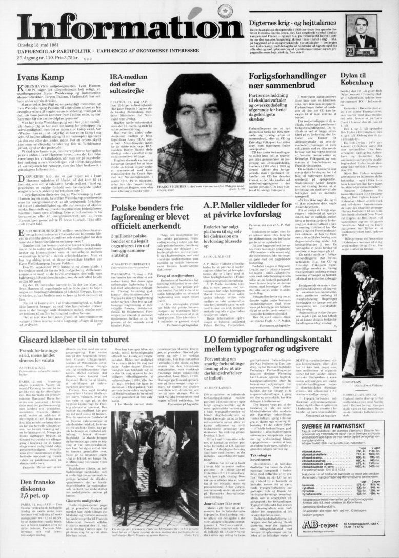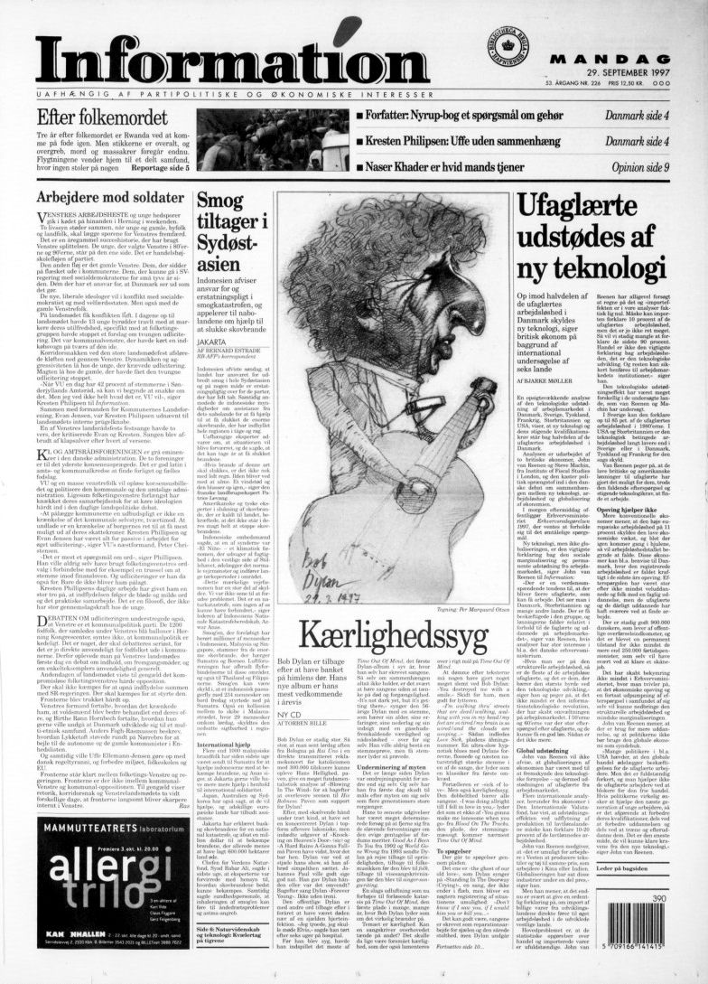 INFORMATION, full name: DAGBLADET INFORMATION, is a Danish newspaper published Monday through Saturday. It was established and published by the Danish resistance movement in 1943 during World War II. The newspaper, despite being politically independent, is regarded as left liberal, or left-wing, and is known for being equally critical in its point of view of all political organizations.