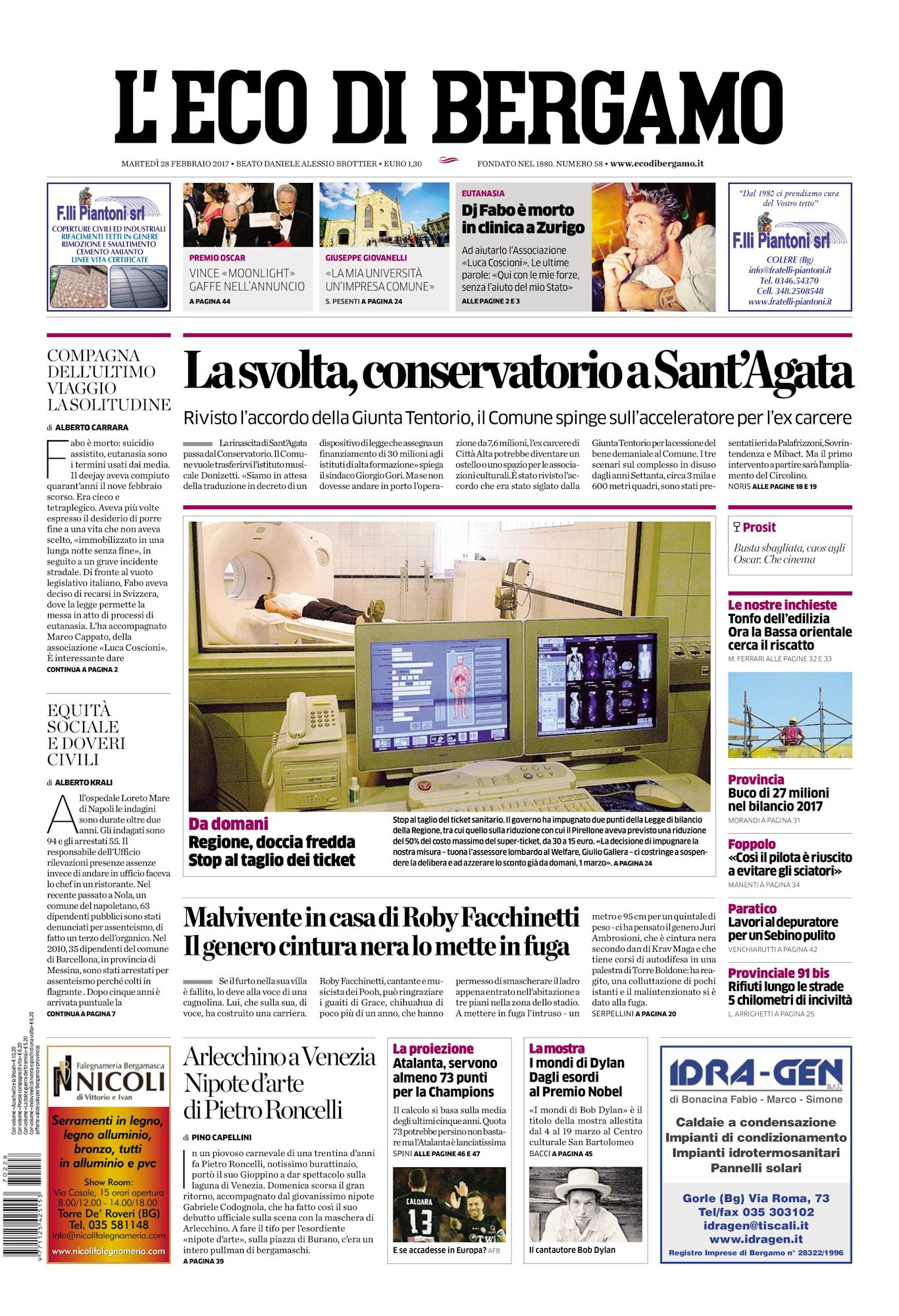 L'ECO DI BERGAMO (lit. 'The Echo of Bergamo') is a daily newspaper published in Bergamo, Italy. The paper has been in circulation since 1880. Below: 28 February 2017. Thank you to Eric Galzi for this item [0126].