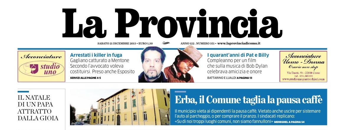 LA PROVINCIA (lit. 'The Province') is an Italian daily newspaper based in Como. It serves the northern Lombard provinces of Como, Lecco, and Sondrio. Below: 21 December 2013. Thank you to Eric Galzi for this item. [0126]