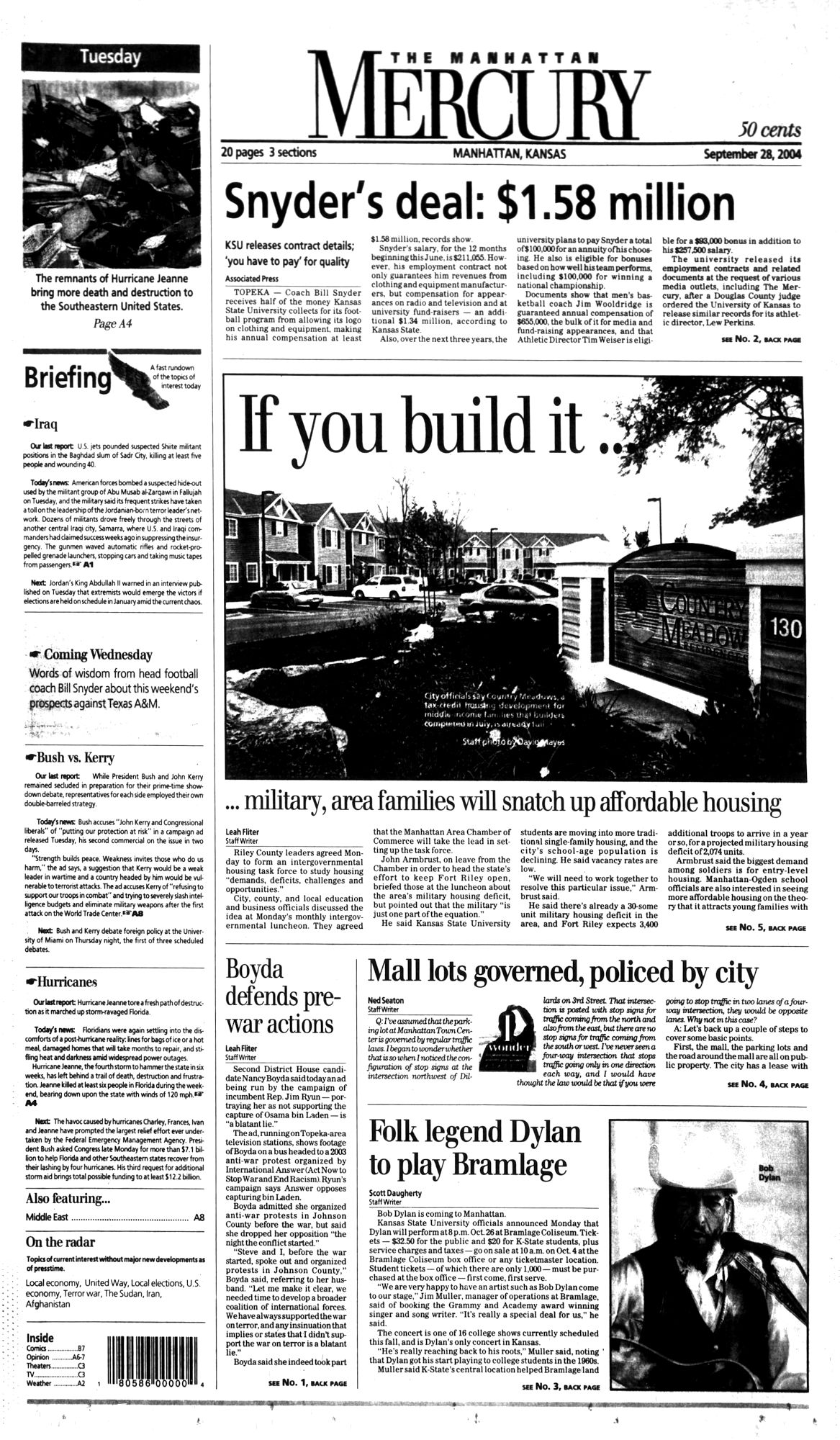 THE MANHATTAN MERCURY is the local newspaper for Manhattan, Kansas. The Mercury is a daily newspaper published in the afternoon five days a week, and in the morning on Sunday. No Saturday edition is issued. The newspaper is physically printed on the Mercury's own in-house presses. The newspaper also maintains an online presence.