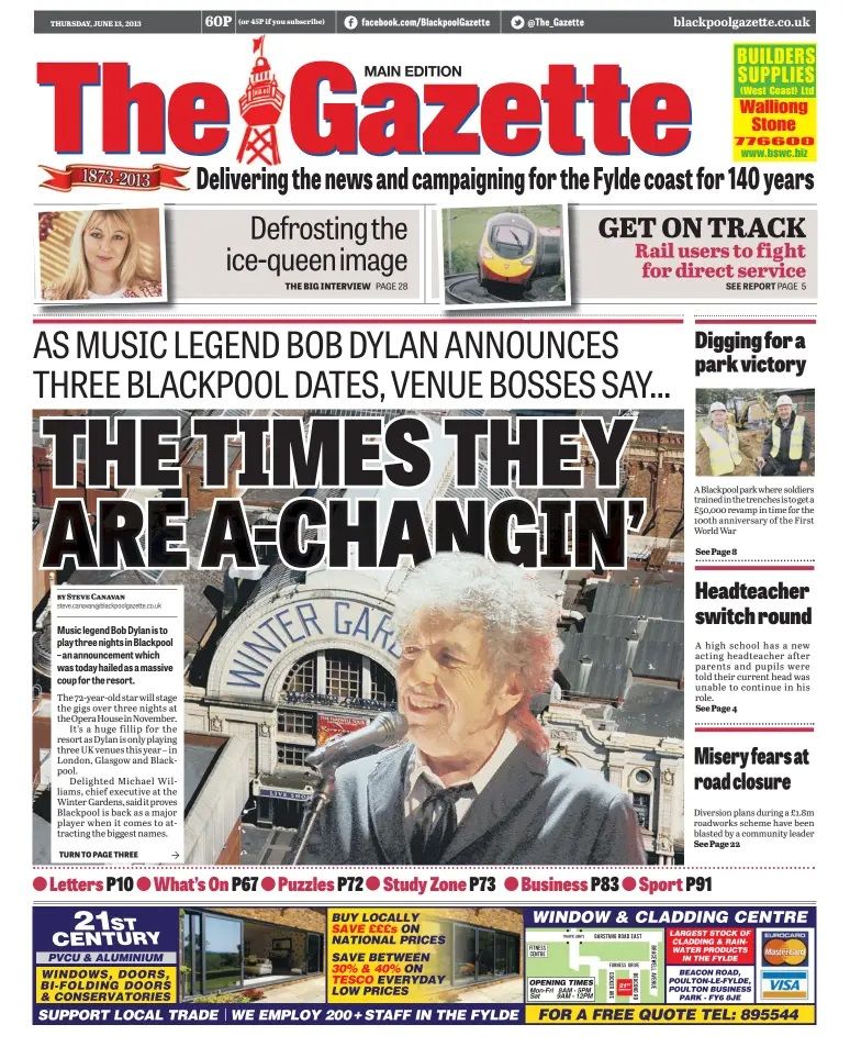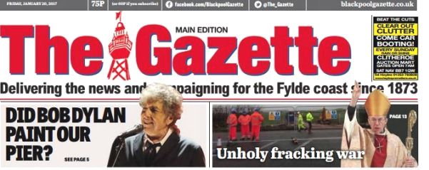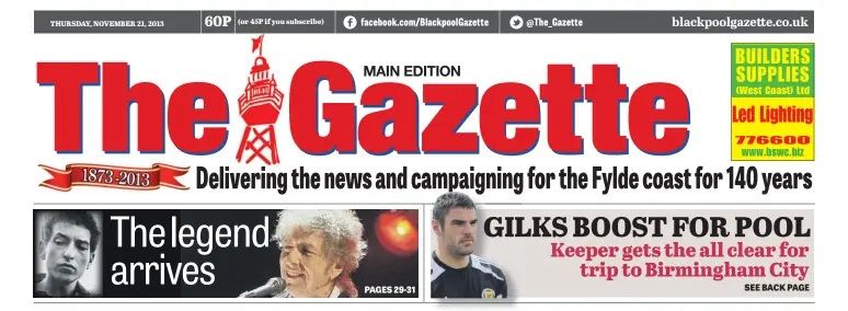 THE BLACKPOOL GAZETTE (locally marketed as simply THE GAZETTE) is an English daily newspaper based in Blackpool, Lancashire. Published every day except Sunday, it covers the towns and communities of the Fylde coast. It was founded as THE WEST LANCASHIRE EVENING GAZETTE in 1929 before being renamed the EVENING GAZETTE, and then BLACKPOOL GAZETTE. The paper's history dates back to a weekly publication founded in 1873.