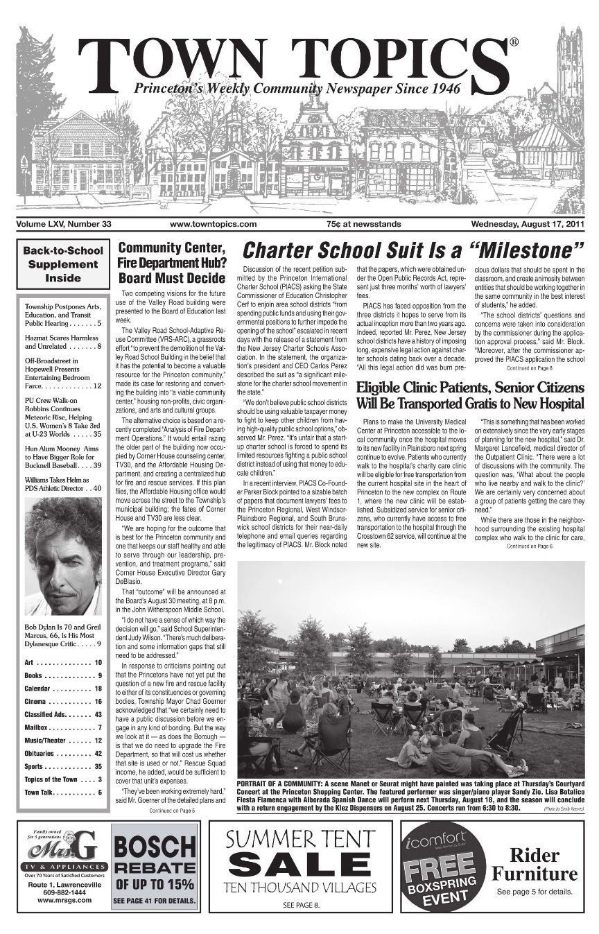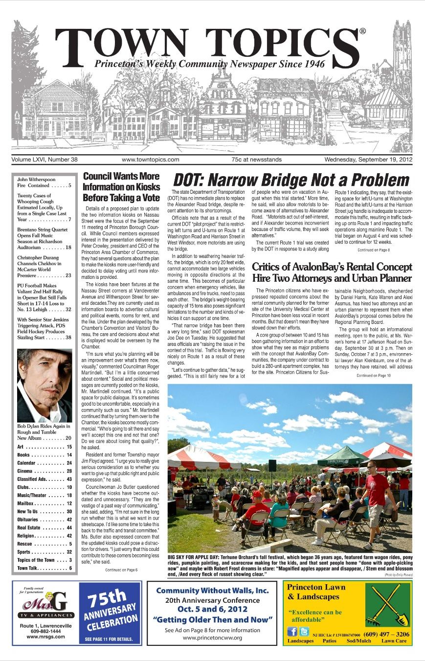 "Princeton's Weekly Community Newspaper Since 1946". TOWN TOPICS is a free weekly newspaper distributed to households of the New Jersey municipalities of Princeton and parts of Hopewell Borough, Hopewell Township, West Windsor Township, Lawrence Township, Pennington, Montgomery Township, and South Brunswick Township, with an estimated circulation of 15,600.
