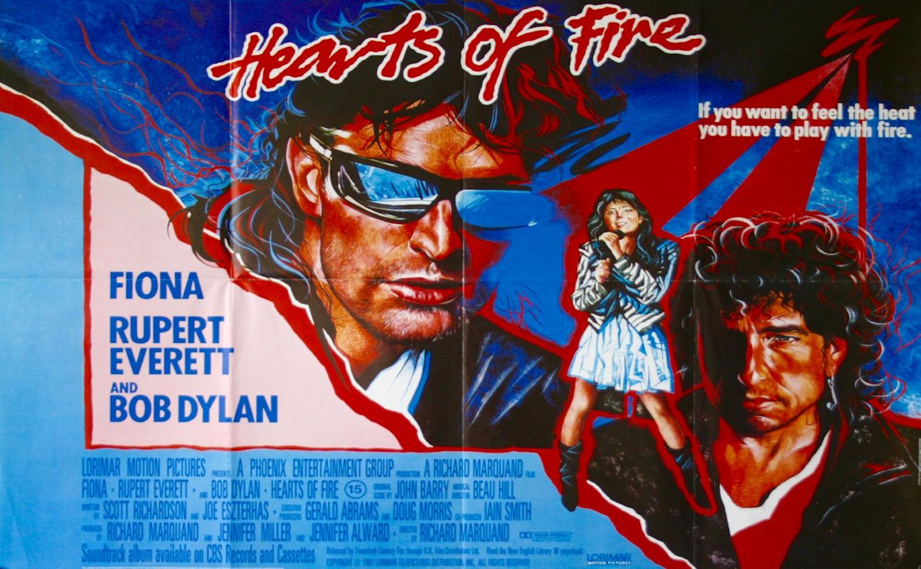 HEARTS OF FIRE is a 1987 American musical drama film starring Bob Dylan, Fiona Flanagan (billed only as "Fiona") and Rupert Everett. The film was essentially a vehicle for Dylan based on his success as a rock musician. It received poor reviews, a limited theatrical release and was later written off by Dylan himself...