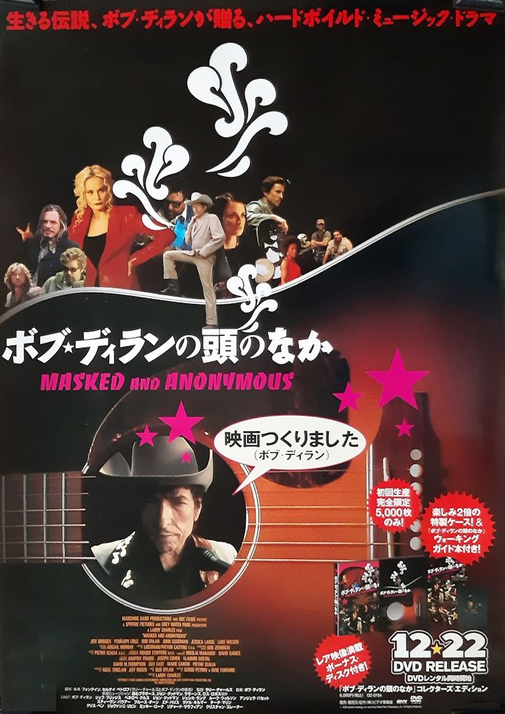 MASKED AND ANONYMOUS is a 2003 drama film directed by Larry Charles. The film was written by Larry Charles and Bob Dylan, the latter under the pseudonym "Sergei Petrov". It stars Dylan alongside a star-heavy cast, including John Goodman, Jeff Bridges, Penelope Cruz, Val Kilmer, Mickey Rourke, Jessica Lange, Luke Wilson, Angela Bassett, Bruce Dern, Cheech Marin, Ed Harris, Chris Penn, Steven Bauer, Giovanni Ribisi, Michael Paul Chan, Christian Slater and Fred Ward.