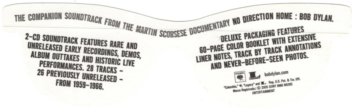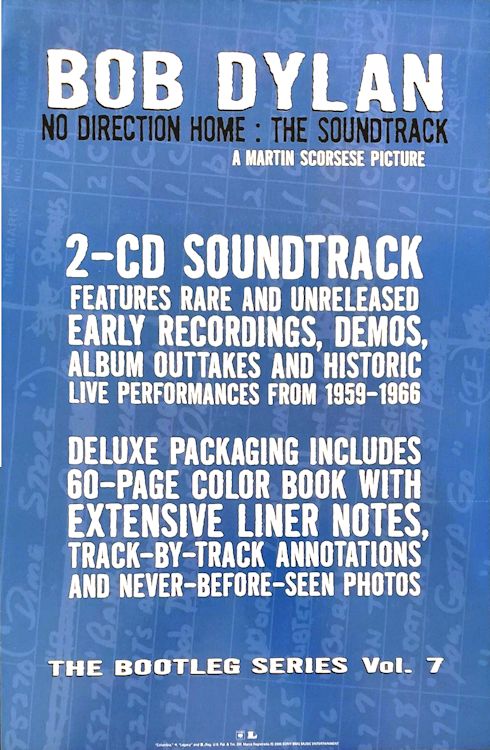 THE BOOTLEG SERIES VOL. 7: NO DIRECTION HOME - THE SOUNDTRACK is a compilation album by Bob Dylan. The fifth installment in the ongoing Bob Dylan Bootleg Series, it was released in 2005 in conjunction with the Martin Scorsese PBS television documentary on Dylan, NO DIRECTION HOME, and was compiled with Scorsese's input. It features mostly previously unreleased material from Dylan's formative years to his rise as an international figure, from 1959 to his 1966 world tour. [0226]