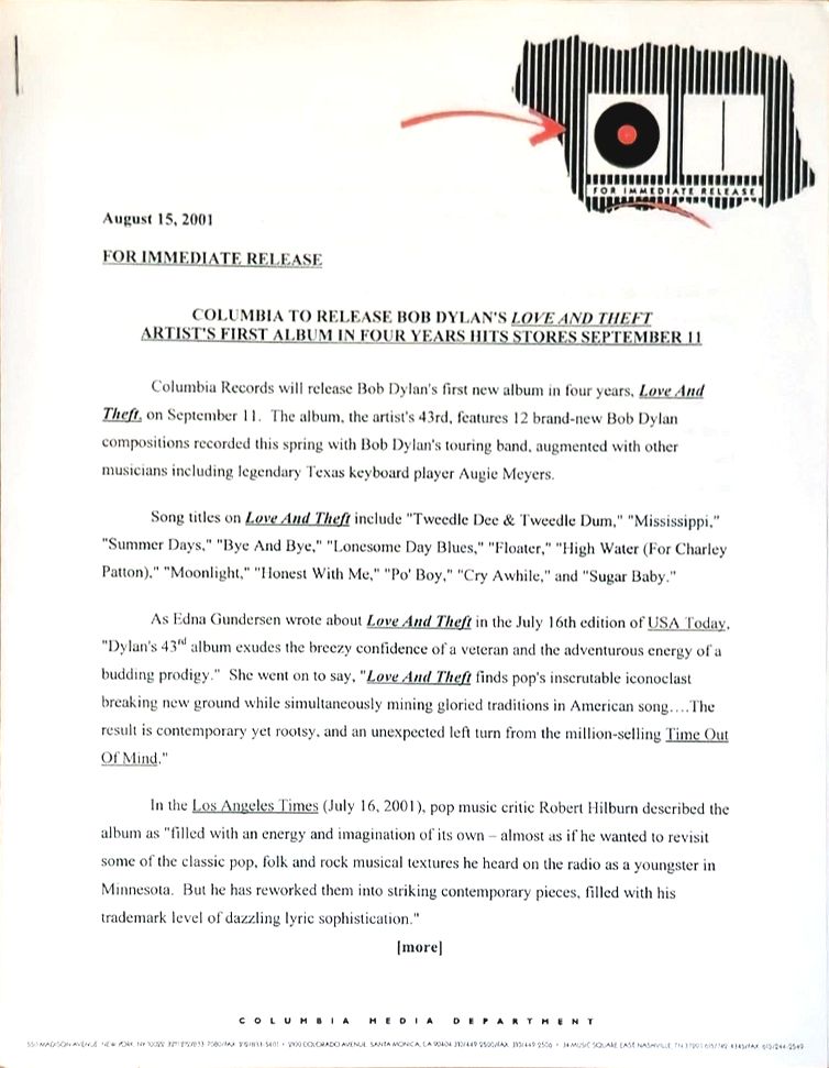 Below: Postcard-sized Columbia advertising flyer promoting the album and Bob's 2001 US tour, with the chance to win prizes by entering an ID number at bobdylan.com Information and scan searchingforagem.com