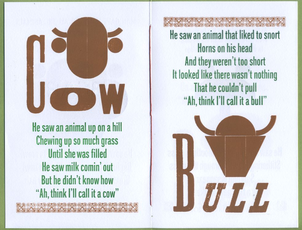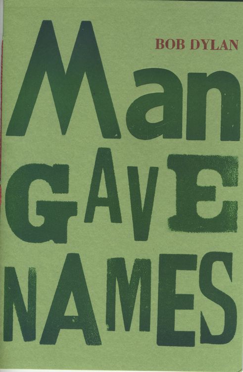 This booklet (13,5 x 20,5 cm) has 6 fold-out pages in a green cover; hand printed. Limited to 35 hand-numbered copies. It presents the lyrics of the 1979 Bob Dylan song Man Gave Names To All The Animals.