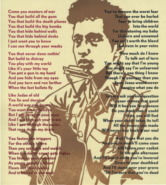Letterpress & Linocut by Maarten, this is the lyrics of the famous song, more than ever relevant today; hand-printed, limited to 33 hand-numbered copies, 11,6 cm x 25,8 cm.
