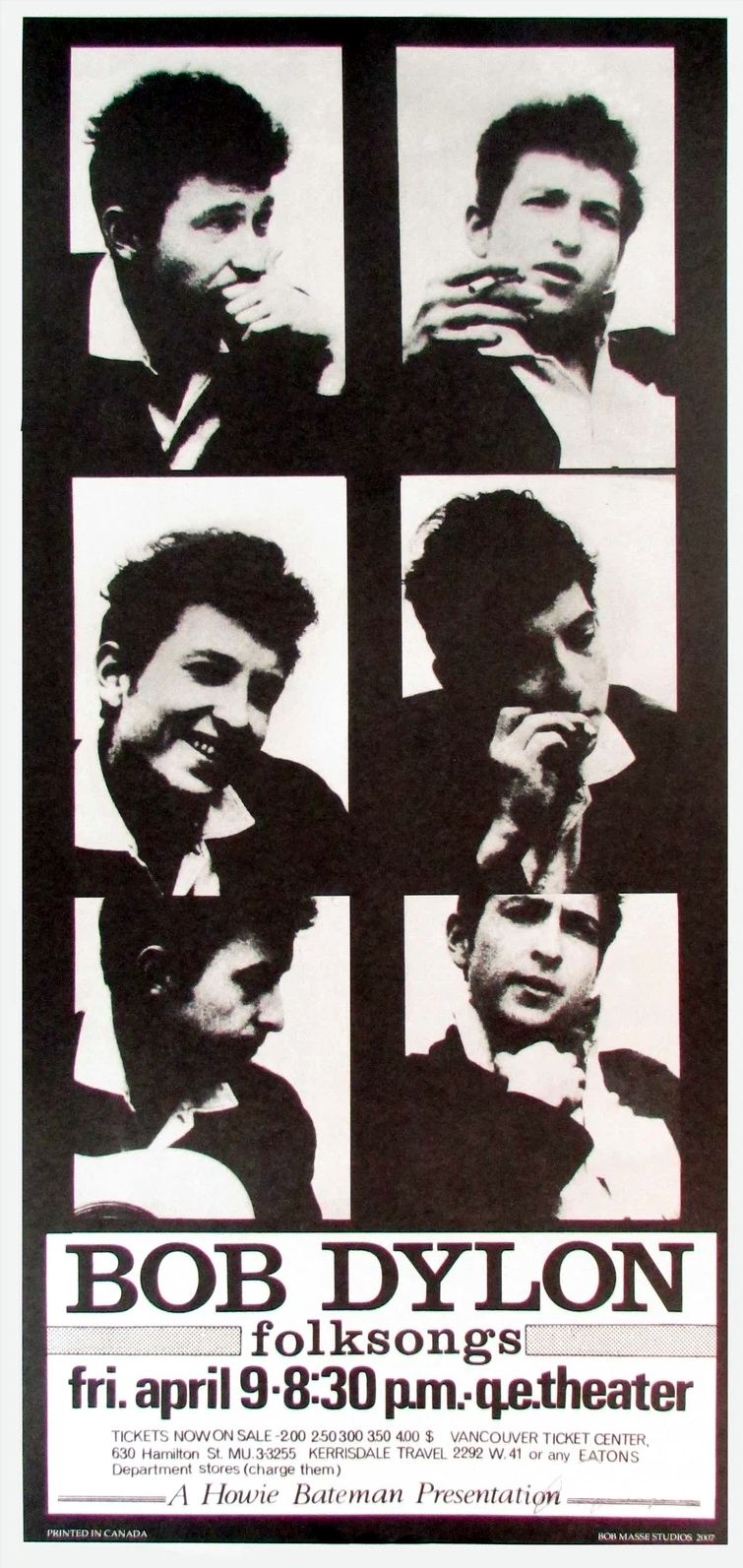 Bob Dylan performed in the Queen Elizabeth Theatre on 9 April 1965. He was still obscure there at that time, and his name was misspelled on the poster as BOB DYLON.