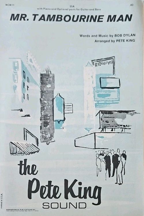 "Mr. Tambourine Man" is a song written, composed, and performed by Bob Dylan, who released his original version of it on his 1965 album BRINGING IT ALLL BACK HOME. The Byrds also recorded a version of the song that they released in the same year as their first single on Columbia Records, reaching number 1 on both the Billboard Hot 100 chart and the UK Singles Chart, as well as being the title track of their debut album, MR. TAMBOURINE MAN. The Byrds' recording of the song was influential in popularizing the musical subgenres of folk rock and jangle pop, leading many contemporary bands to mimic its fusion of jangly guitars and intellectual lyrics in the wake of the single's success.